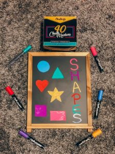 Chakola recently gifted me with a 40 chalk marker box as well as a chalkboard. These chalk markers are amazing. I knew I immediately wanted to use them as a learning tool for my daughter. I used the fun colors and drew different shapes on the chalkboard. I wanted to have my daughter point at the shapes I call out to her. She loved it! What I like about this is we can keep adding shapes, because I just have to draw them. Here’s a video below of us practicing our shapes.